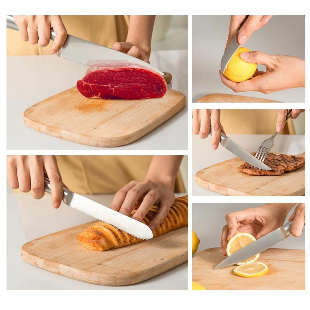 A különböző méretű és típusú kések megfelelőek minden konyhai előkészülethez, legyen szó akár szeletelésről, pucolásról, húsok vagy zöldségek előkészítéséről. Kiváló minőségű rozsdamentes acél pengéi élesek és tartósak, így időtálló kelléke lesz konyhádnak. Ezzel a készlettel a főzés örömtelibb és hatékonyabb élménnyé válik.