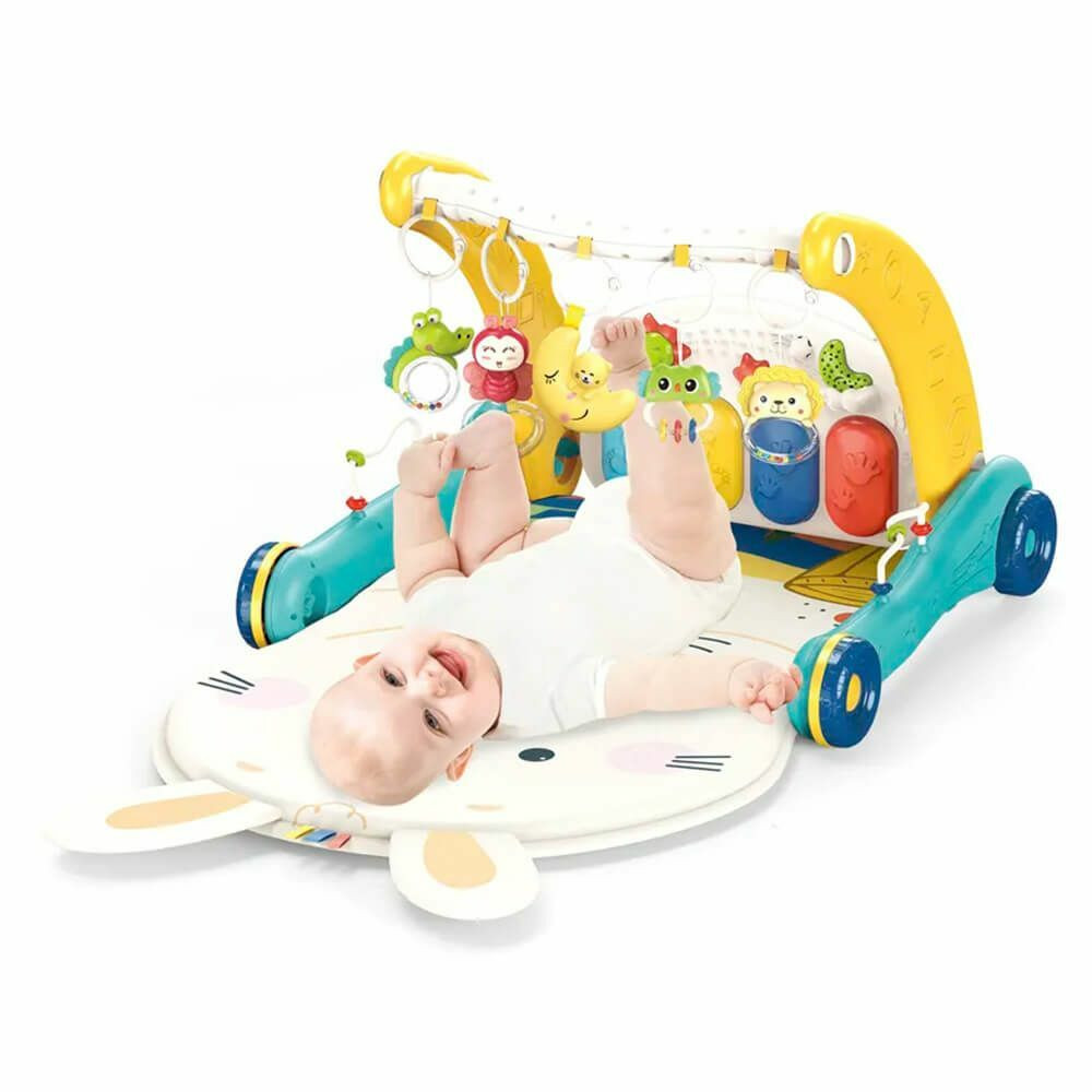 A játszószőnyeg kényelmes, puha fekhelyet biztosít a kicsiknek, miközben figyelmét lekötheti a színes, lógó játékok megfigyelésével vagy a zenélő zongora gombok használatával. A lógó játékok nem csak barátságos megjelenést biztosítanak, de fejleszti a gyerekek tapintási és vizuális érzékeit. A játszószőnyeg beépített zongorával rendelkezik, mely nyomásra különböző dalokat játszik le. A zongora gombjai világítanak, mely tovább fokozza a játékélményt. A járássegítő kerekekkel van ellátva, stabilan rögzített kapaszkodója már a legkisebbeknek is segít az első lépések megtételében.