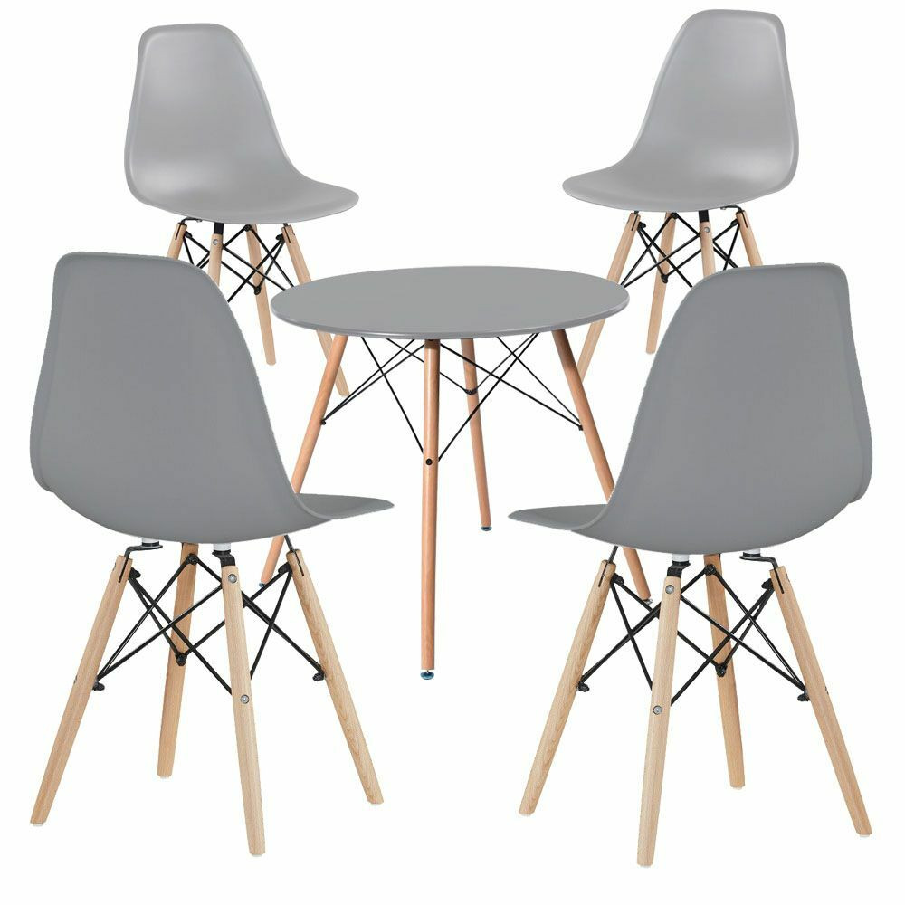 Ez a modern étkezőgarnitúra otthon vagy egy vendéglátó egységben is megállja a helyét. A bútorok tervezése során a műanyag, a fém és a fa is jelentős szerepet kapott, ezek ötvözete igazán különleges megjelenést biztosít. Az étkezőszékekhez egy 60,5 cm átmérőjű asztal is tartozik. A szett fehér, fekete és szürke színben kapható, így mindenki megtalálja a számára megfelelőt.