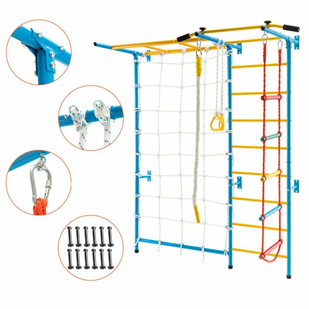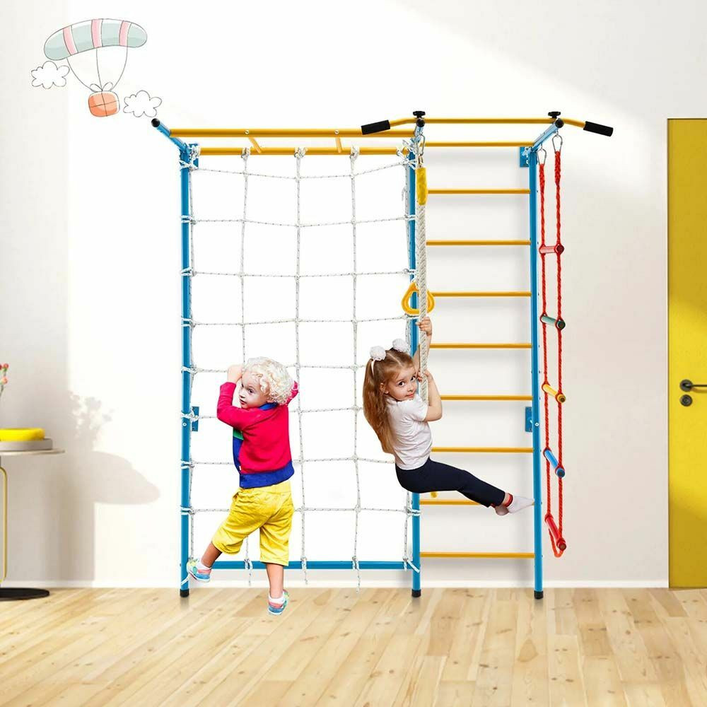 A beltéri sportfalat rögzítheted bármely helyiség falához, így megfelelő stabilitást biztosít miközben a gyermekek önfeledten játszanak. Található rajta kötéllétra, fém fokos mászólétra, kötélfal, mászókötél, húzódzkodó rúd valamint húzódzkodó kötél és egy felső kapaszkodó létra is.