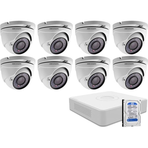 8 db HDTVI dome kamera (infra LED), 8 csatornás HDTVI/AHD képrögzítő, 1000 GB HDD.