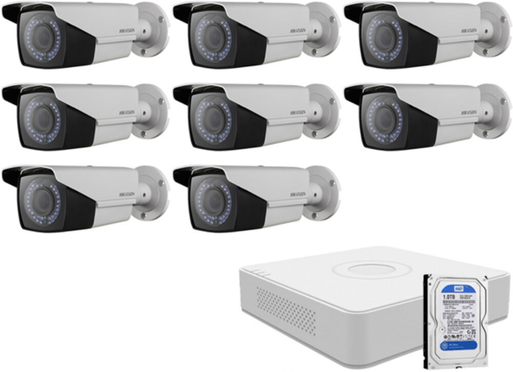 8 db HDTVI varifokális kamera (infra LED), 8 csatornás HDTVI/AHD képrögzítő,1000 GB HDD.