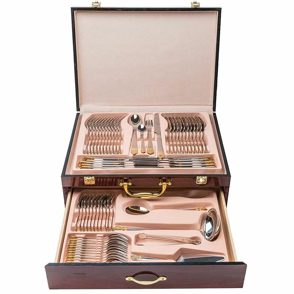 84 részes étkészletünk elegáns díszdobozban található, amellyel akár 12 személyre is tudsz tálalni a mindennapokban és különleges alkalmakkor, ünnepnapokon is. A felső szinten a kanalak, villák, kések, a kihúzható fiókban pedig a kiegészítő darabok találhatóak. Kiváló ajándék lehet pároknak, háztartásokba, de vendéglátó egységekben is remekül használható.