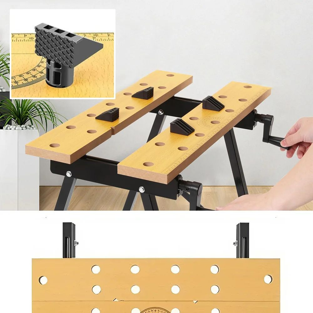 Az asztallap két része közötti távolság tekerőgombbal állítható, így könnyedén rögzíthetsz különféle méretű munkadarabokat. A beépített szögmérő és vonalzó segíti a pontos beállítást, legyen szó fűrészelésről, ragasztásról vagy összeszerelésről.