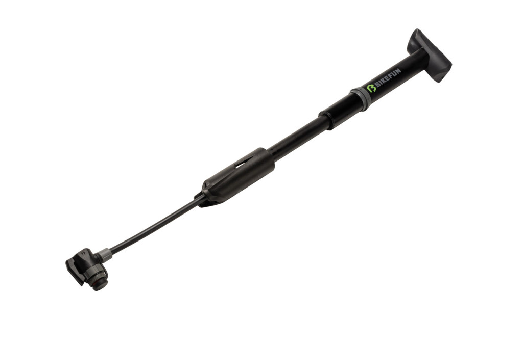 Alumínium minipumpa MTB kerékpárokhoz. Hossz: 10". Ergonomikus T markolat. Maximális nyomás 80 psi. Egyszerű "Clever Valve" illesztés AV/FV szelepekhez. Kihúzható pumpacső.