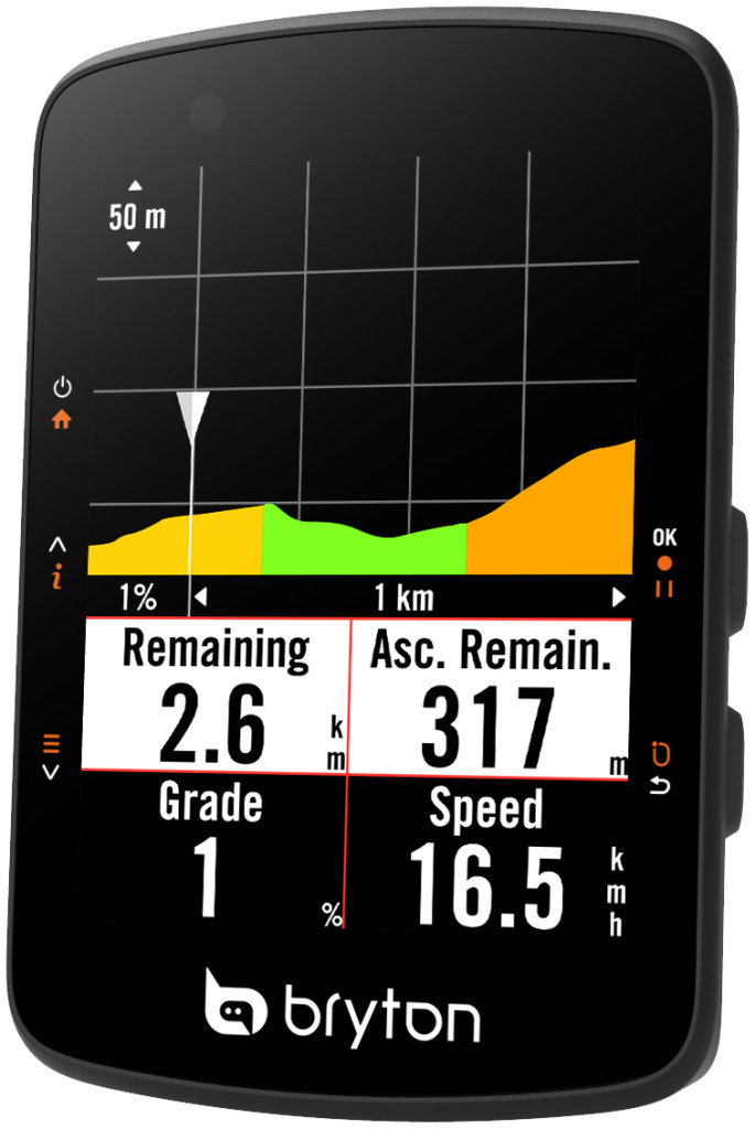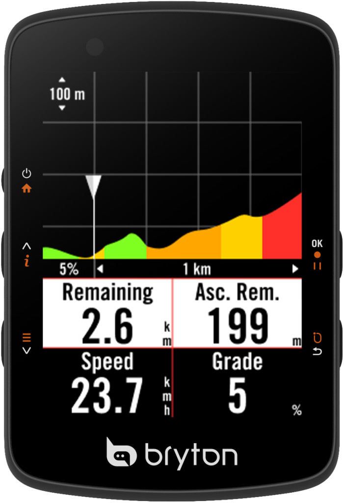 Amint közeledsz egy emelkedőhöz, a Climb Challenge funkció színes grafikus előnézetet mutat a szakaszról: láthatod a meredekséget, a hátralévő távot és a szintemelkedést. Ez segít, hogy jobban felkészülj az emelkedők leküzdésére edzés közben!