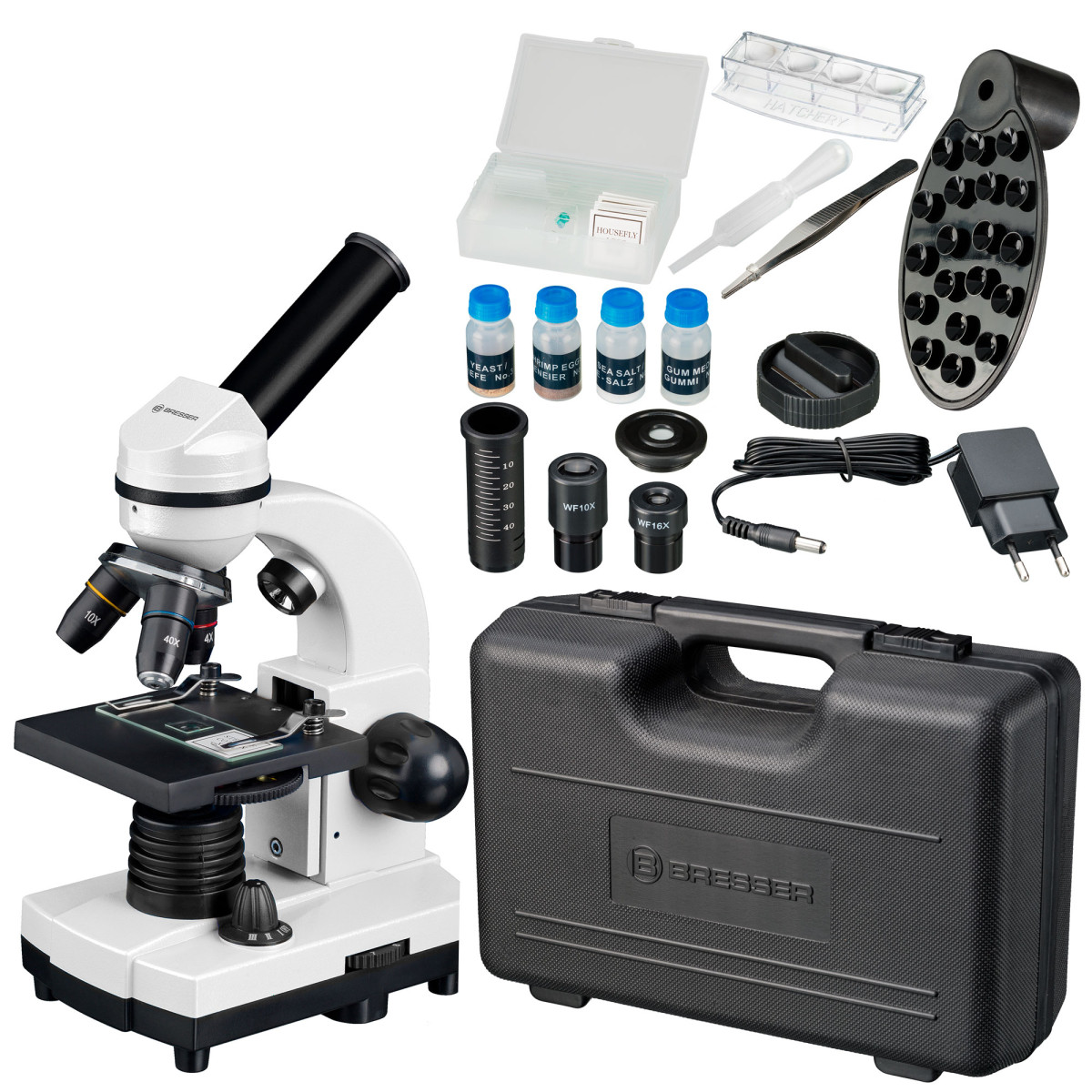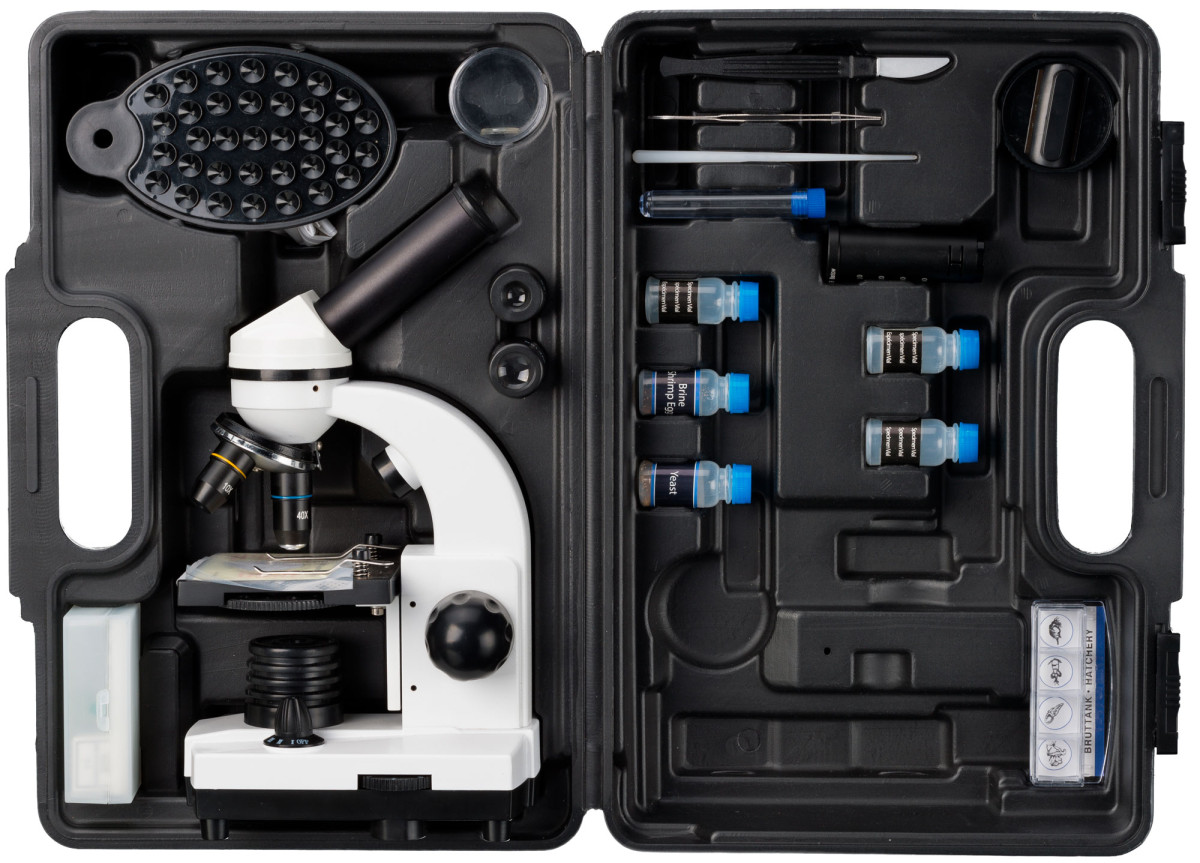 The practical hard-shell case allows you to transport the microscope and helps to store all these accessories.