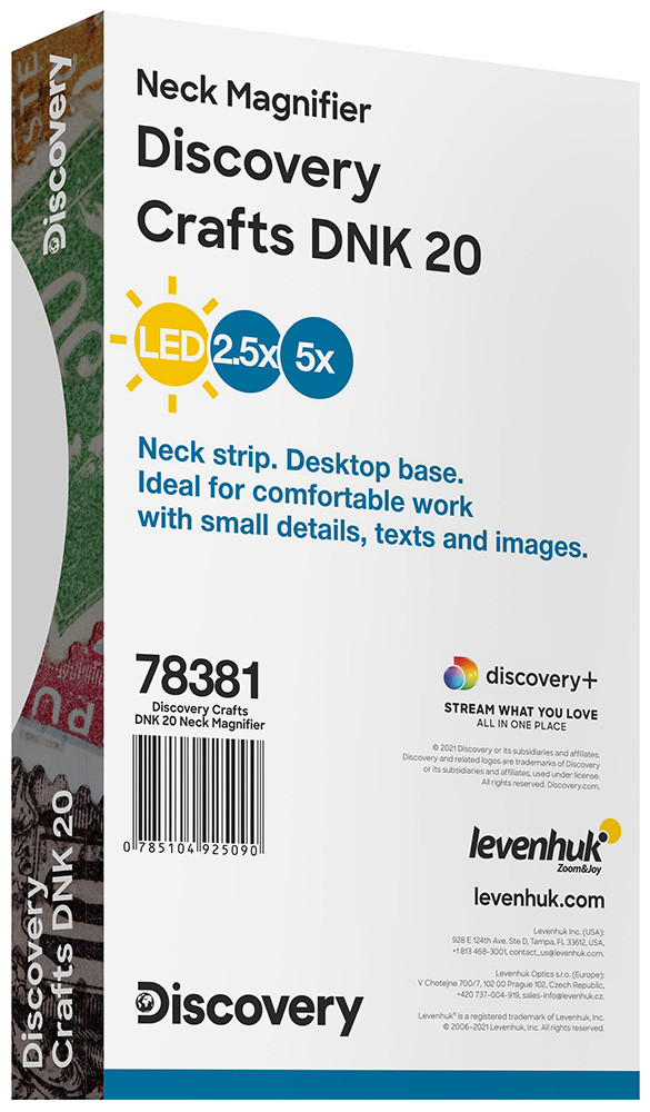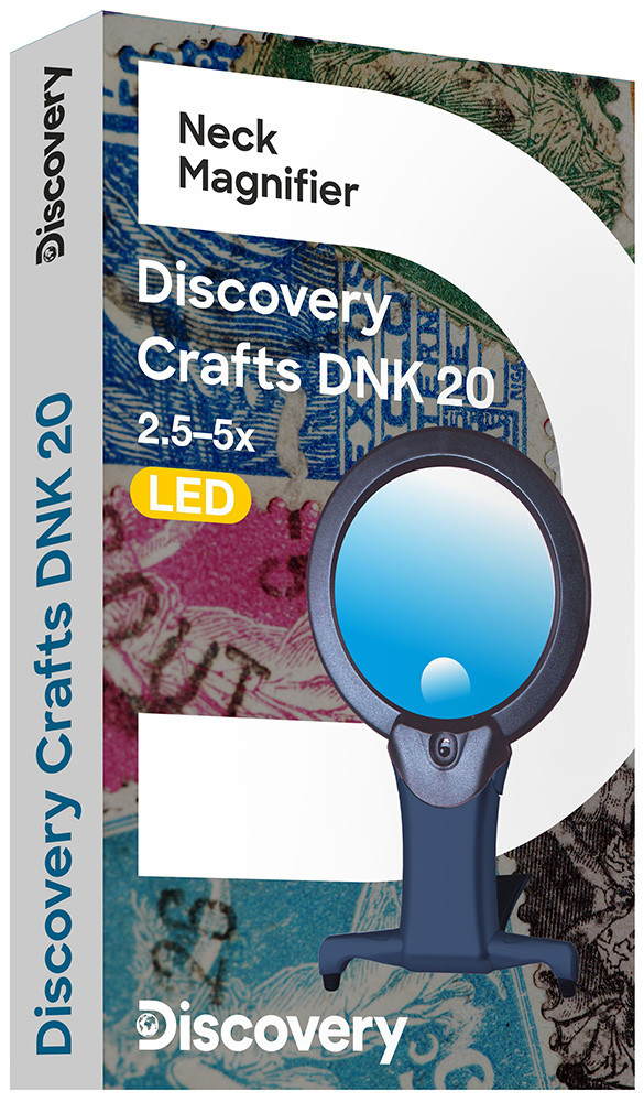 A Levenhuk Discovery Crafts DNK 20 közepes méretű nyakba akasztható nagyító nagy segítség lehet a háztartási munkában vagy hobbikban. Nem foglalja le a kezét, nagy látómezőt biztosít, így alkalmas varrásra, kötésre, gyöngyfűzésre, valamint plüssjátékok és más kézműves termékek készítéséhez. Megkönnyíti az apró betűs részek olvasását, a fényképalbumok megtekintését stb. Ez a nagyító jó választás azoknak, akik nem akarnak lemondani kedvenc hobbijukról a nem tökéletes látás miatt.