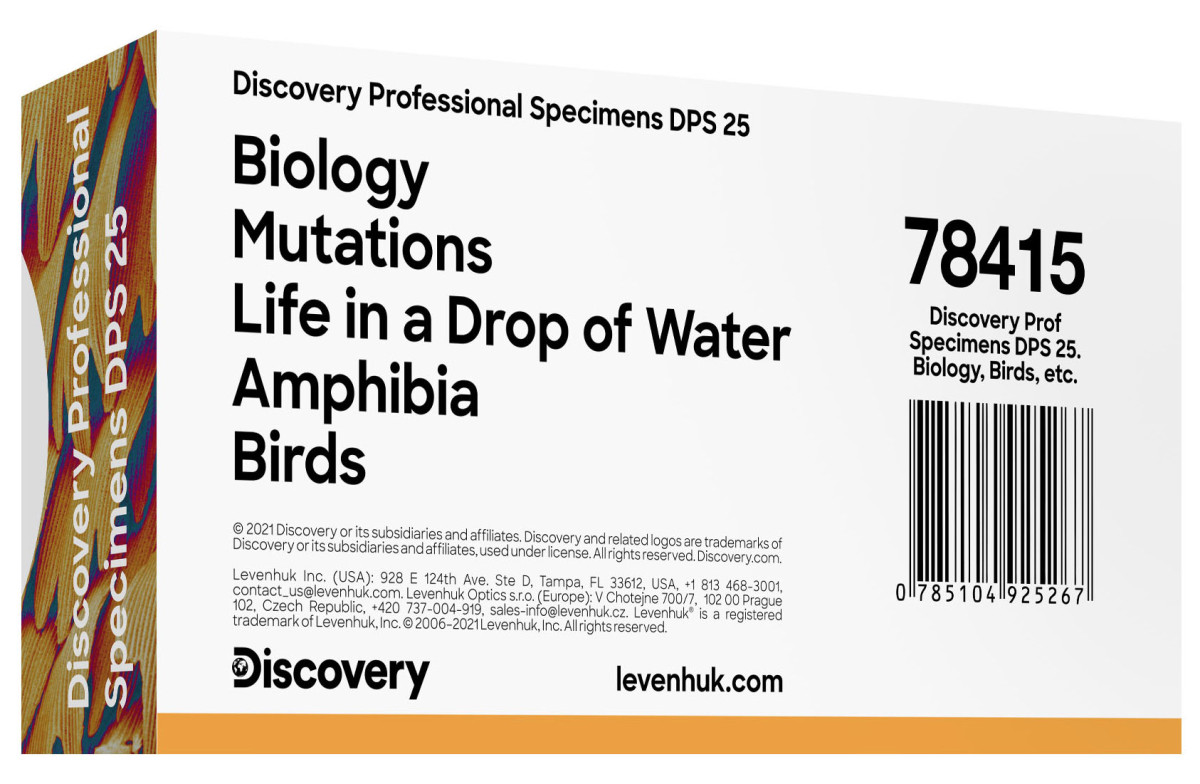 A Levenhuk Discovery Prof DPS 25 mikropreparátum mintakészlet. „Biológia, Madarak stb.” – előkészített tárgylemezekből álló, 25 darabos nagy készlet mikroszkóppal végezhető kutatásokhoz. A Levenhuk Discovery Prof DPS 5 sorozat öt speciális készletét tartalmazza: „Madarak”, „Mutációk”, „Élet egy csepp vízben”, „Kétéltűek” és „Madarak”. A készletekkel tanulmányi tapasztalatok szerezhetők az egyes biológiai tudományágak terén és átfogó betekintést nyújtanak az élő szervezetek felépítésébe is. A számtalan növényi és állati minták egy része tipikus, más részük külső tényezők által sérült szövetet tartalmaz.