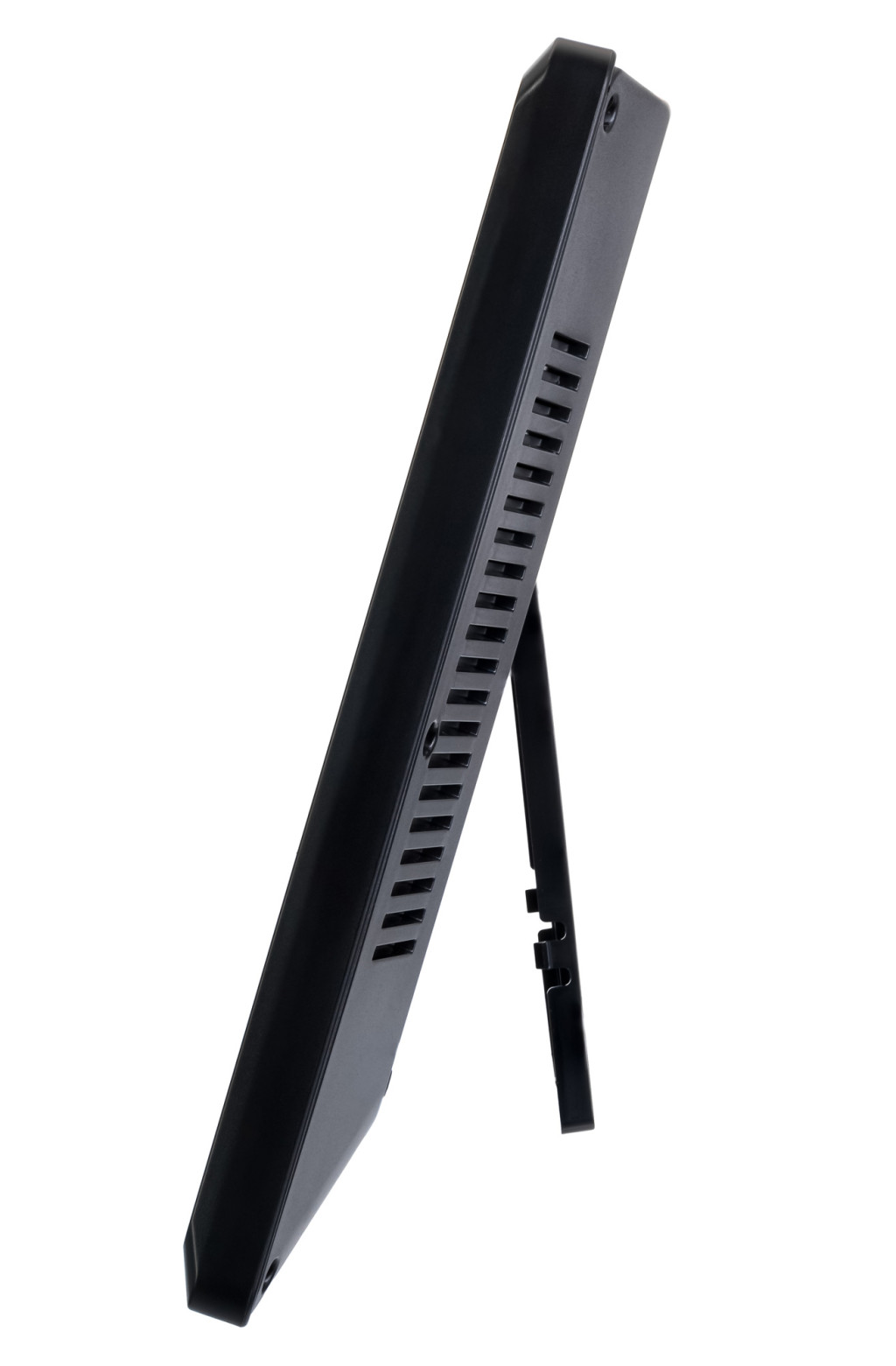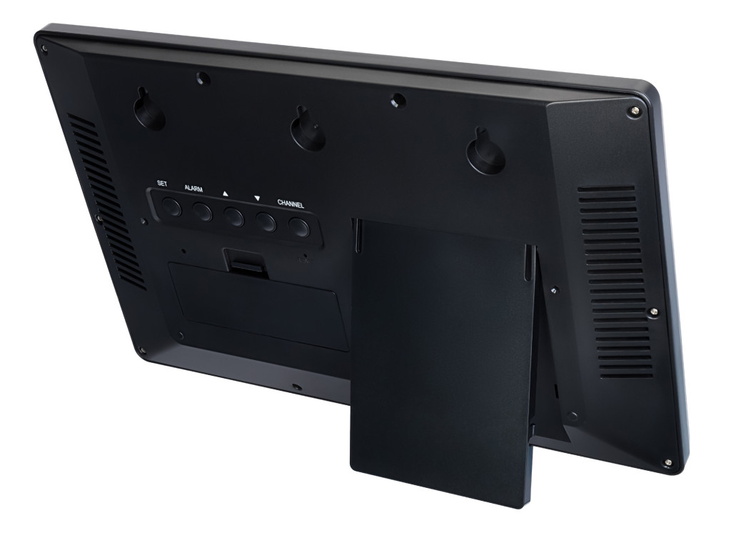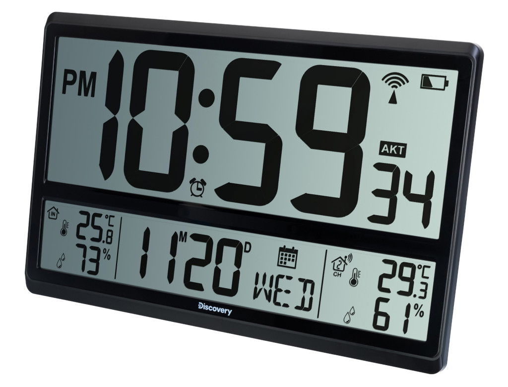 Az előlapon monokróm kijelzőpár található. A felső nagyobb méretű az idő kijelzésére szolgál. Az értékek nagyméretűek és tisztán olvashatók, a számjegyek akár távolról is könnyen láthatók. Az alsó kijelző kisebb méretű. Középső részén naptár bal és jobb oldalon a beltéri és kültéri hőmérséklet- és páratartalom-mérés értékei jelennek meg. A vezérlőgombok a hátlapon helyezkednek el.