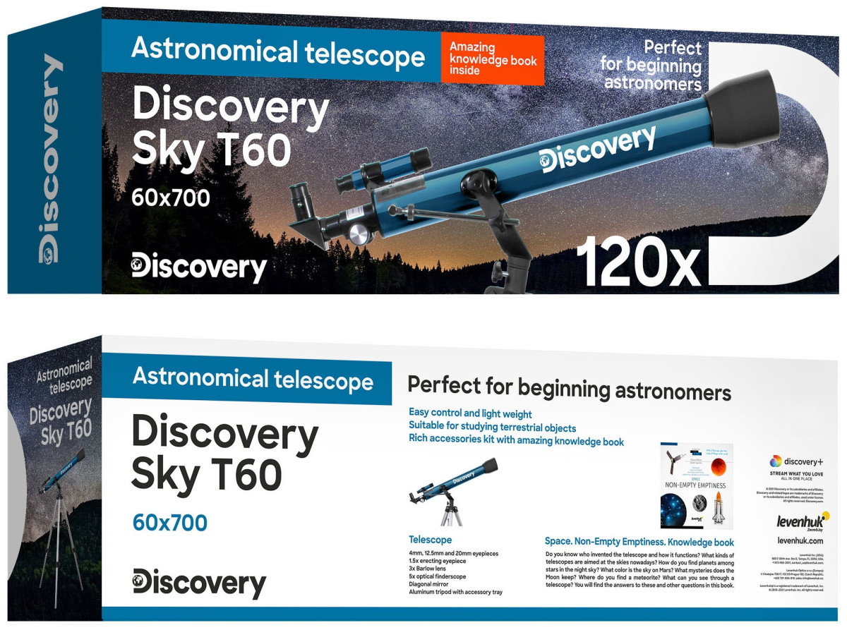 A Levenhuk Discovery Sky T60 klasszikus azimut refraktor. Nagyszerű választás kezdők számára. Egyrészről az optika lehetővé teszi a világűr számos objektumának megfigyelését (könnyedén tanulmányozhatja a Holdat például), másrészről pedig pár perc alatt megtanulhatja a teleszkóp kezelését. A teleszkóp vitathatatlan előnye a kibővített tartozékkészlet – semmit nem kell külön hozzá megvásárolnia! A készlethez a világűrt bemutató ismeretterjesztő könyv is hozzátartozik.