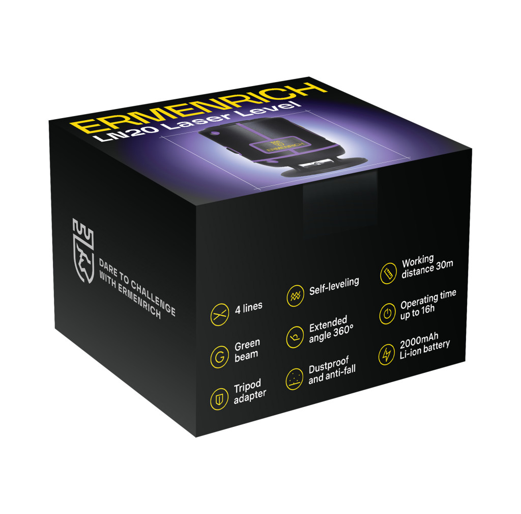 Az Ermenrich PLUS LN20 olyan hordozható önbeálló lézeres szintező, amely négy vízszintes zöld vonalat hoz létre. Vízszintes vetítési tartomány: teljes 360°. Az eszköz ideálisan használható építési és felújítási munkákhoz, valamint berendezések és világítás felszereléséhez. A nagy munkatávolság nagy terület lefedését teszi lehetővé anélkül, hogy a készüléket ehhez meg kellene mozdítania, a lézer akár távoli falakat is elér. A kompenzátor csillapítja a rezgéseket, és automatikusan beállítja a lézer síkját.