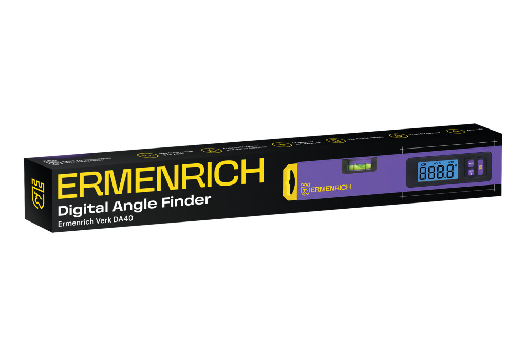 A berendezés munkatartománya 0–230°, a mérések eredményei a beépített LCD-kijelzőn jelennek meg. A két vízmértékkel is rendelkező Ermenrich Verk DA40 alumíniumból és erős ABS-műanyagból készült. A készülék ütésálló, és hosszú élettartamú. A kalibrálás automatikusan történik. Bizonyos funkcióval „rögzíteni”, valamint nullára lehet állítani a mérési eredményeket. A szögmérő 9 voltos elemmel működik. Az automatikus kikapcsoló funkció kíméli az elemet.