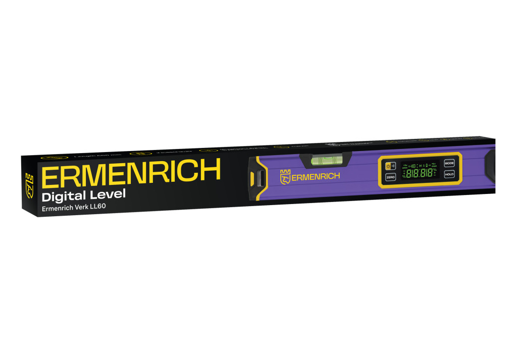 Az Ermenrich Verk LL60 digitális vízmérték professzionális és otthoni használatra egyaránt alkalmas sokoldalú eszköz. A szögeket 0–360° (4x90°) tartományban tudja mérni. Magasfokú precizitásának köszönhetően a készülék egyaránt alkalmas építkezéseken és szerszámgépekkel (mágneses szinuszlemezek, moduláris rögzítők), összeszerelő gépekkel, fémszerkezetekkel és gyártóberendezésekkel történő munkavégzésre. A készülék egy lakásban vagy vidéki házban végzett javításoknál is hasznos.