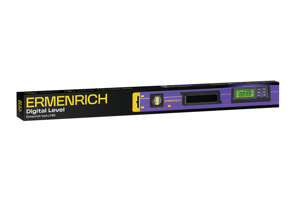 Az Ermenrich Verk LY80 egy digitális szintező pontos szögméréshez és pozicionáláshoz. Széleskörű felhasználásra alkalmas, pl. építőipar, javítás, fém- és famegmunkálás, gépek és mechanizmusok telepítése stb. terén. Alkalmas háztartási felhasználásra is (bútorszerelés, polcok, csuklós szekrények, függönykarnisok stb. elhelyezése). A szögmérő 0–360° (4x90°) tartományban tud precíz méréseket végezni. A szerszám nullázási funkciót és tartás funkciót is kínál.
