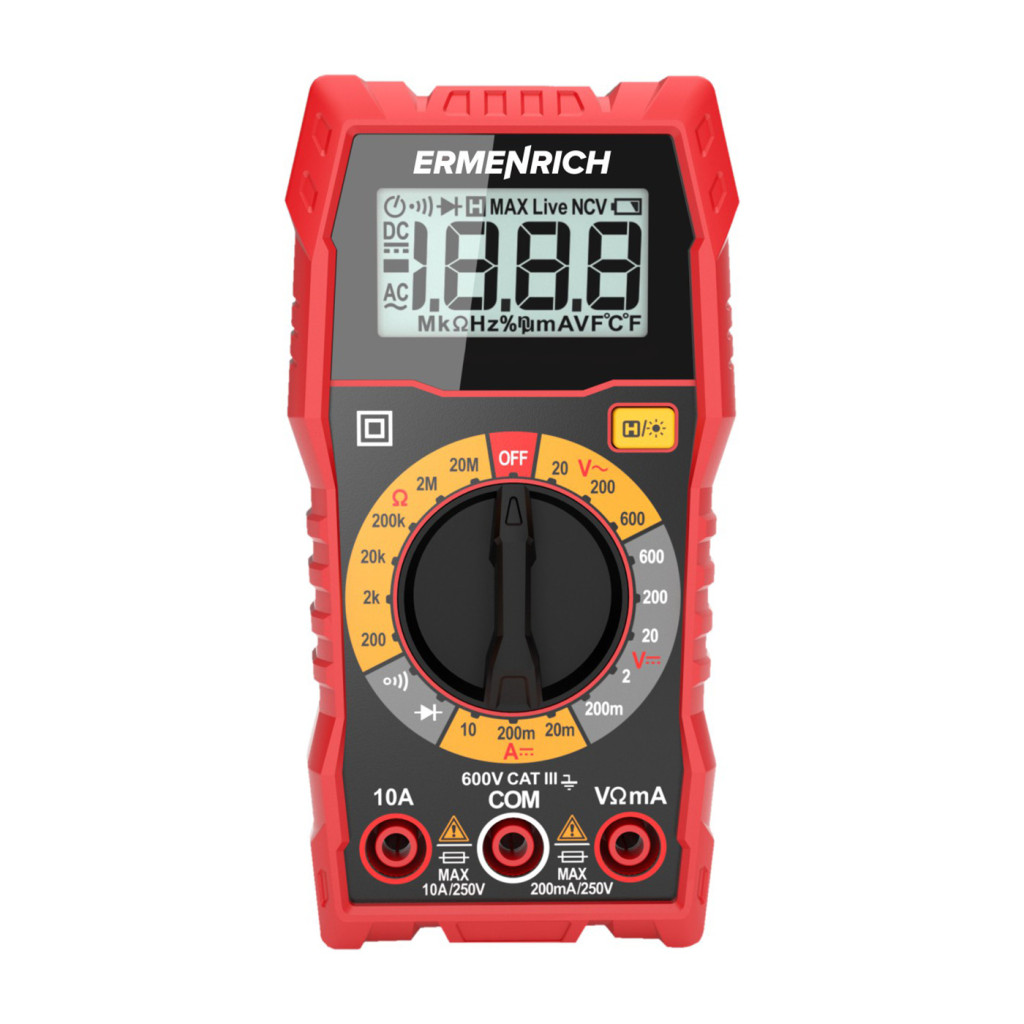 A klasszikus forgókapcsolóval ellátott Ermenrich Zing TC07 digitális multiméter egyen- és váltóáramú (DC és AC) feszültség, egyenáramú (DC) áramerősség és ellenállás mérésére szolgál. Funkciói elegendőek a legtöbb otthoni feladat elvégzéséhez, valamint a professzionális villanyszerelők munkája során jellemző, alapvető mérésekhez.
