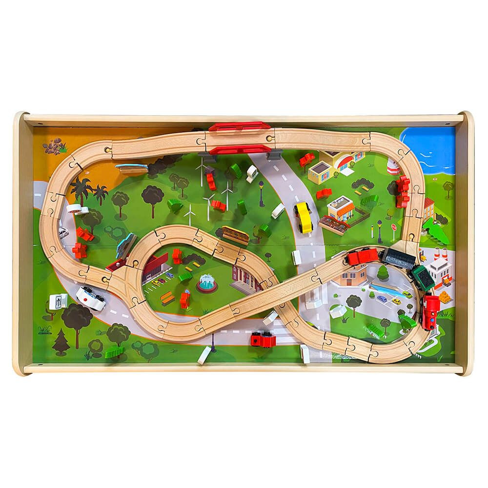 A szett tartalmaz egy összecsatolható vonatot vonatkocsikkal, valamint autókat és aranyos emberformákat, amik életre keltik a kisvárost. A híd, a fák és a házak további lehetőséget adnak a gyerekeknek, hogy megalkossák saját történeteiket és világukat. Ez a masszív, fából készült terepasztal nemcsak szórakoztató, hanem segít fejleszteni a finommotoros készségeket és a problémamegoldó képességet is.