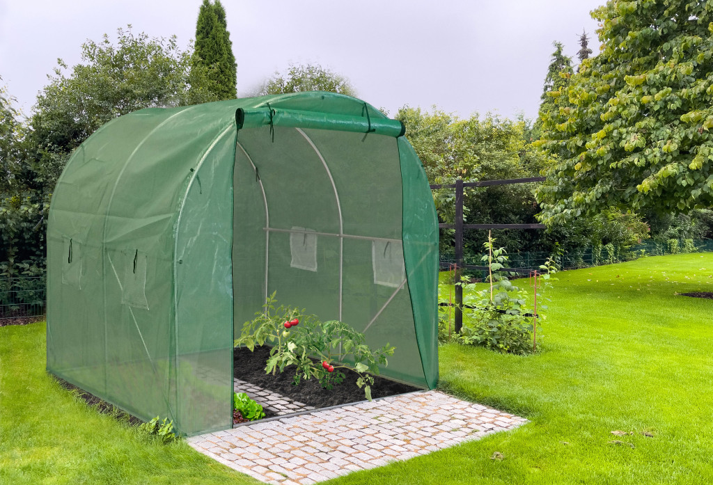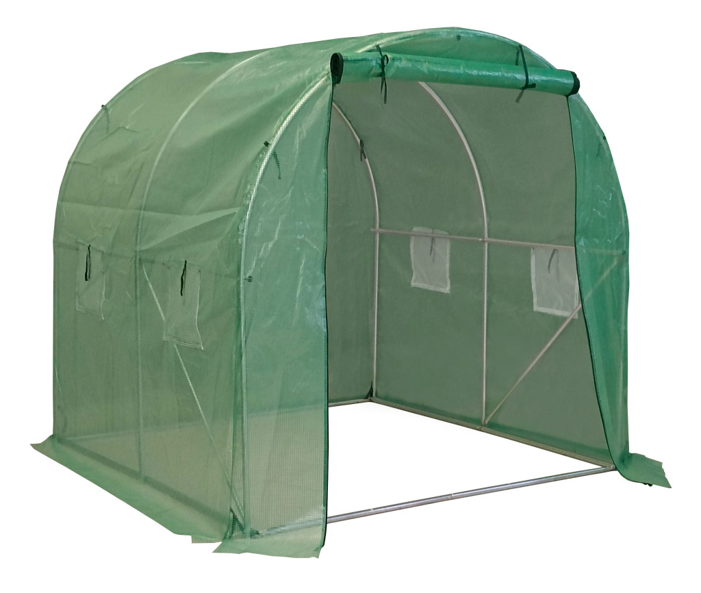 Kerti fóliasátor stabil horganyzott acélszerkezettel, minőségi erősített polietilén (PE) fóliával, elülső fal 120 cm széles bejárati nyílással, 4 szellőzőablakkal, 4 rögzítő kötéllel és csapokkal, cipzáras felgöngyölíthető bejárattal.