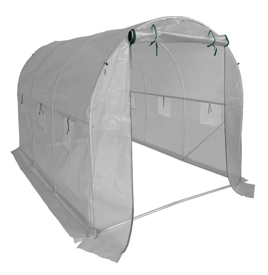 Kerti fóliasátor stabil horganyzott acélszerkezettel, minőségi erősített polietilén (PE) fóliával, elülső fal 120 cm széles bejárati nyílással, 6 szellőzőablakkal, 4 rögzítő kötéllel és csapokkal, cipzáras felgöngyölíthető bejárattal.