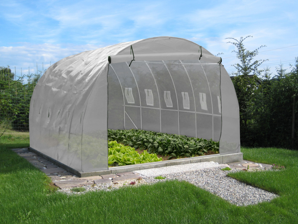 Kerti fóliasátor stabil horganyzott acélszerkezettel, minőségi erősített polietilén (PE) fóliával, elülső fal 200 cm széles bejárati nyílással, 12 szellőzőablakkal, 4 rögzítő kötéllel és csapokkal, cipzáras felgöngyölíthető bejárattal.