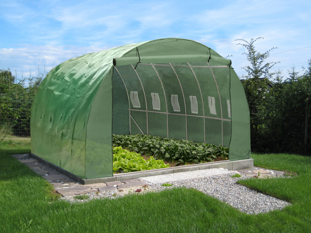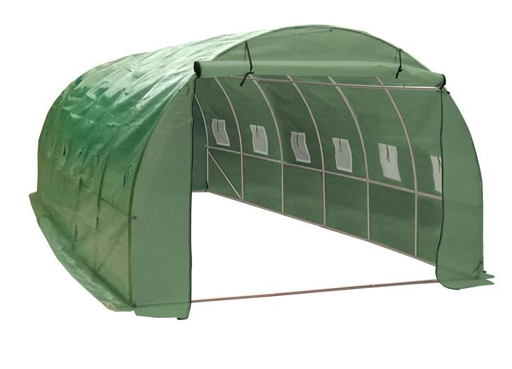 Kerti fóliasátor stabil horganyzott acélszerkezettel, minőségi erősített polietilén (PE) fóliával, elülső fal 200 cm széles bejárati nyílással, 12 szellőzőablakkal, 4 rögzítő kötéllel és csapokkal, cipzáras felgöngyölíthető bejárattal.