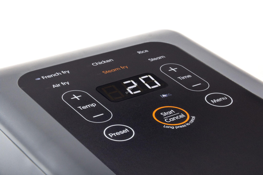 6 alapprogram – Sült krumpli, Csirke, Rizs, Sütés (Air Fry), Grillezés / sütés gőzfőzéssel (Steam Fry), Gőzfőzés (Steam)