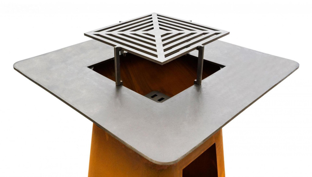 Robusztus corten grill planchával, speciális felületkezelés a hosszú élettartam érdekében, grillfelület mérete 85 x 85 cm, grill magassága 90,5 cm, fa tárolására alkalmas hely.. A csomag tartalmazza a grill burkolatát és a tartozékokat is.