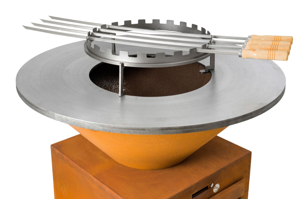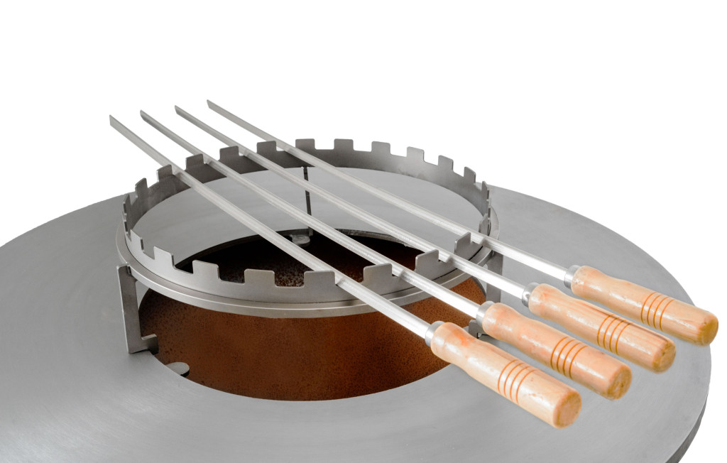 Tartozék fatüzelésű grillsütőkhöz - rozsdamentes acél állvány 6-8 nyárshoz, átmérője 42 cm, magassága a tűztér felett 14 cm.