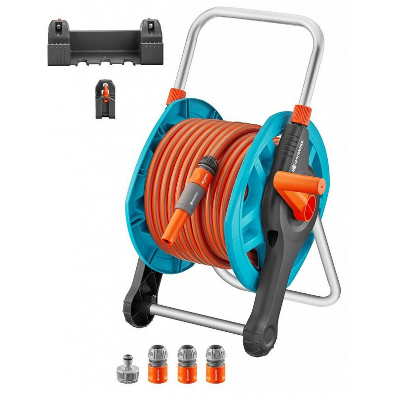A GARDENA Basic fali tömlődob készlet (25 m) segítségével könnyedén öntözheted a növényeket, virágokat és ágyásokat. A használatra kész Basic fali tömlődob készlet tartalmaz egy 25 m hosszú, 13 mm (1/2”) átmérőjű Basic tömlőt, egy fali konzolt, egy csapelemet 26,5 mm-es (G 3/4") és 33,3 mm-es (G 1") menettel rendelkező vízcsapokhoz, három Basic tömlőelemet, egy Basic Vízmegállítót, valamint egy Basic tisztító locsolót. A 2 az 1-ben készletet rugalmasan használhatod a padlóra és a falra szerelve egyaránt. A teleszkópos fogantyú és a speciális összecsukható mechanizmus lehetővé teszi a helytakarékos otthoni tárolást. A nagy kézi tekerővel kényelmesen feltekerheted a tömlőt, miközben a forgó tengely megakadályozza a tömlő elcsavarodását. A szögben álló tömlőcsatlakozással elkerülhető a megtörés, a teljesen szabályozható vízsugárforma pedig a finom permettől a teljes sugárig terjed, amely tökéletes az öntözési és tisztítási feladatokhoz. A Vízmegállítónak köszönhetően a vízáramlás leáll, ha egy tartozékot eltávolítasz. A víz csak akkor indul újra, ha az új elem csatlakoztatva van. A fröccsenés ellen védett csapelem száraz munkát biztosít a csapnál, a speciális formájú csatlakozás pedig biztos tömlőfogást tesz lehetővé. A Basic fali tömlődob készlet (25 m) egy Európában gyártott minőségi termék, amelyre a GARDENA öt év szavatosságot vállal, ha regisztrálod a terméket a gardena.com/registration oldalon a vásárlást követő 3 hónapon belül. Mindig tettre kész öntözés Az Original GARDENA System
