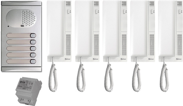 5 lakáskészülék, moduláris kültériegység, tápegység, névtáblával, 4+n vezetékes.