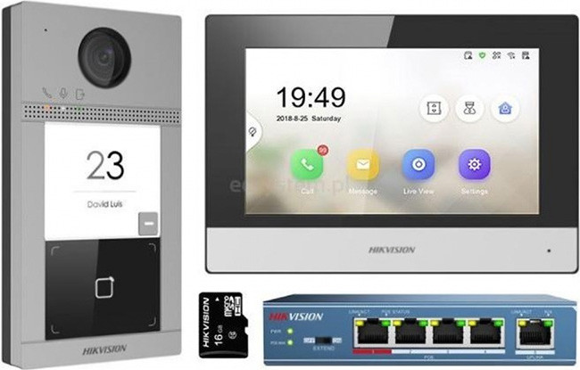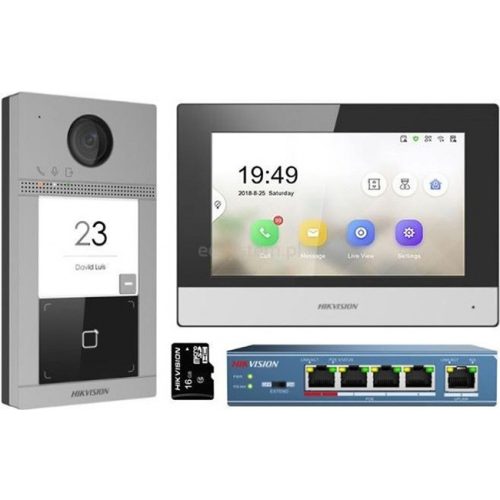 Egylakásos video kaputelefon készlet, IP, 2MP, IR, IP65, 13,56 MHz, 16 GB TF, 12 VDC.
