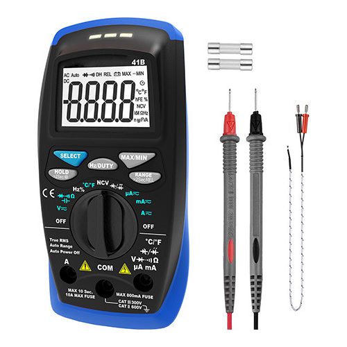 Feszültségtesztelő multiméter, VAC, VDC, dióda, ellenállás, hőmérséklet, frekvencia.
