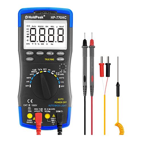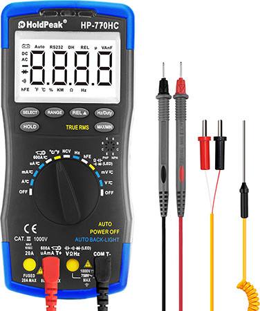 - Mérési funkciók: VDC, VAC, ADC, AAC, ellenállás, dióda, kondenzátor, hőmérséklet, frekvencia.