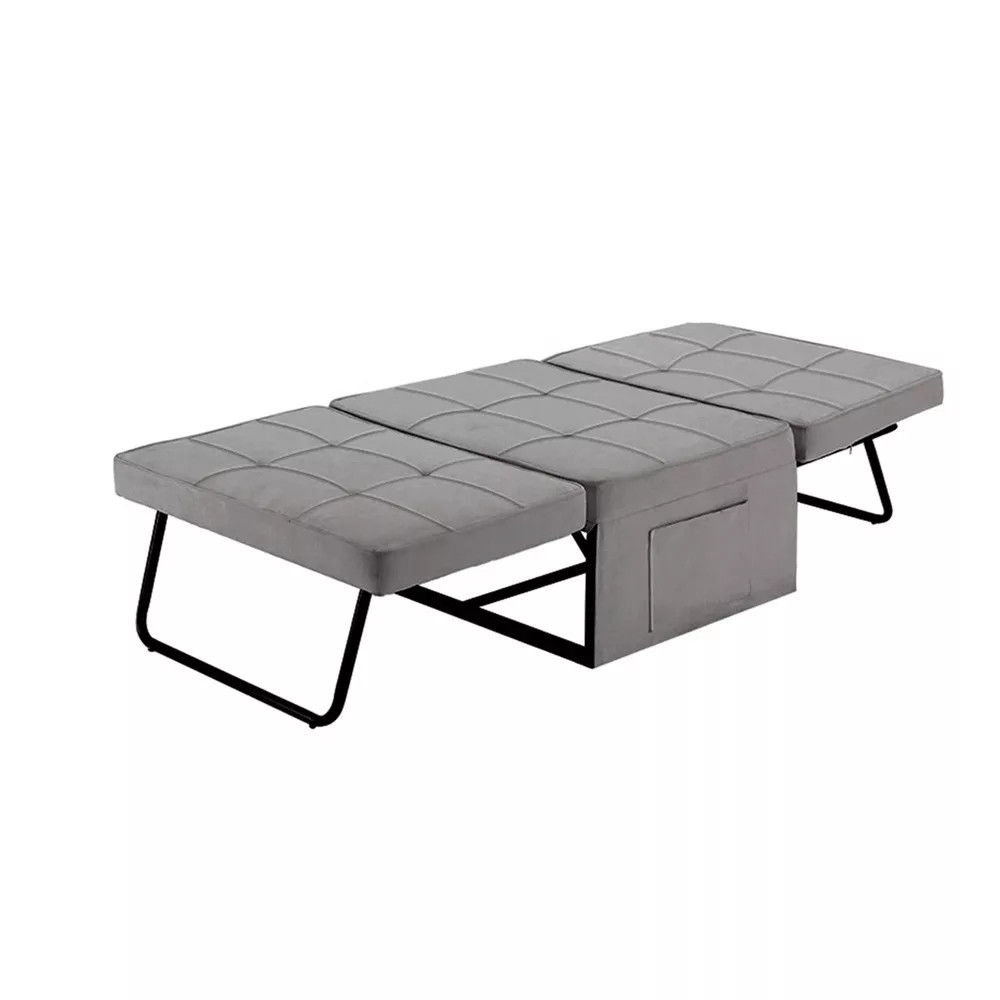 Összecsukva kompakt fotelként használható (77×70×40 cm), kinyitva pedig 80×190 cm-es fekvőfelületet kínál. A praktikus oldalzsebben újságot, távirányítót vagy telefont is tárolhatsz.