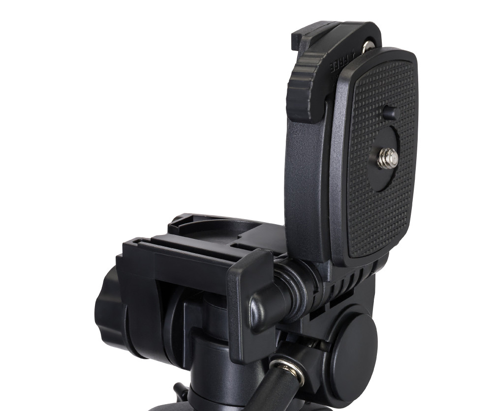 A fejrész 360°-ban forgatható vízszintesen a tengelye körül, illetve előre és hátra dönthető, míg a zár oldalirányban akár 90°-ig eldönthető, lehetővé téve a tökéletes szög megtalálását eszközéhez. Emellett az állvány középső oszlopa opcionálisan egylábú állványként is használható. A gyorskioldó lemez megkönnyíti az eszközök rögzítését és cseréjét az állványon.