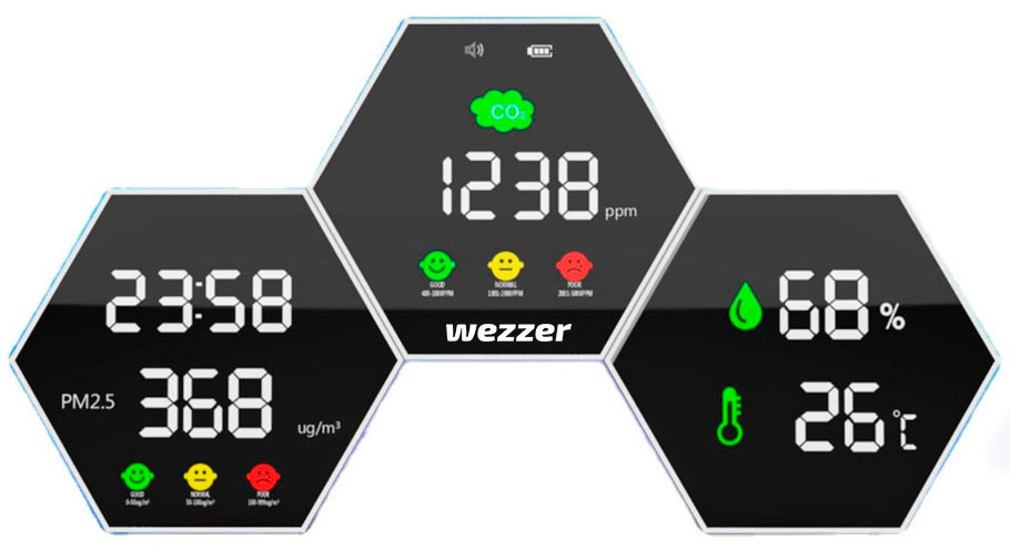 | Beépített funkciók | hőmérő, higrométer, óra, CO₂ érzékelő, levegőrészecske-figyelő |
