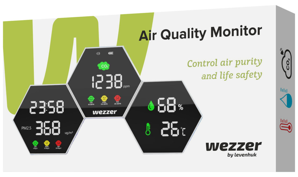 A Levenhuk Wezzer Air PRO DM50 egyik előnye a komfortfokozatot jelző két ikon. A mosolyfejek tájékoztatják Önt arról, hogy mennyire jó minőségű a levegő, amelyet belélegzik. Ezenkívül bizonyos CO₂-értékek túllépésekor riasztások jelennek meg. Így még egy gyermek is meg tudja mondani, hogy ideje kiszellőztetni a helyiséget, ha csak ránéz az érzékelőre. A váz anyaga tartós és nem mérgező ABS műanyagból készült. A három képernyőből álló, látványos kialakítású készülék falra szerelhető vagy asztalra is helyezhető.