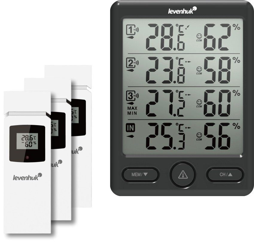 A Levenhuk Wezzer PLUS LP20 olyan időjárás-állomás, amely négy helyen tudja egyszerre mérni a hőmérsékletet és a páratartalmat. Igen praktikus eszköz az időjárás változásainak nyomon követésére, vagy a mikroklíma megfigyelésére akár több helyiségben is, például a telken lévő épületekben. Az időjárás-állomás alapja méri meg a telepítés helyén a hőmérsékletet és a páratartalmat ezt falra lehet szerelni, vagy sík felületre lehet elhelyezni. Három darab vezeték nélküli érzékelő rádiókapcsolaton keresztül továbbítja az adatokat az alapállomásnak. Ezek falra szerelhetők, maximum 100 m távolságban elhelyezve az alaptól.