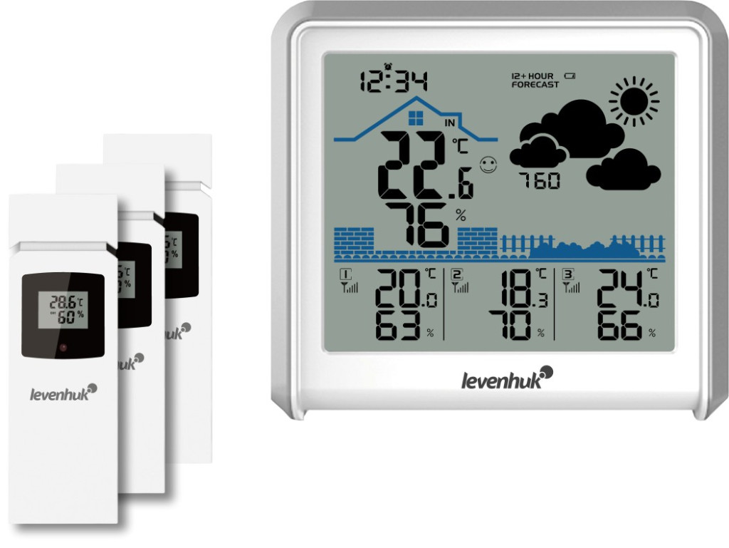 Levenhuk Wezzer PLUS LP50 – többcsatornás időjárás-állomás, amely egyszerre négy helyen képes mérni a hőmérsékletet és a páratartalmat. Az alapállomáshoz három darab távoli érzékelő tartozik, amelyeket különböző szobákban vagy kültéren lehet elhelyezni. Az időjárás-állomás vidéken tudja igazán a hasznosságát bizonyítani, ahol elengedhetetlen a meteorológiai adatok ellenőrzése a termények tárolóhelyeinél és a melléképületekben. Jó szolgálatot tud tenni egy tágas lakásban vagy irodában is.