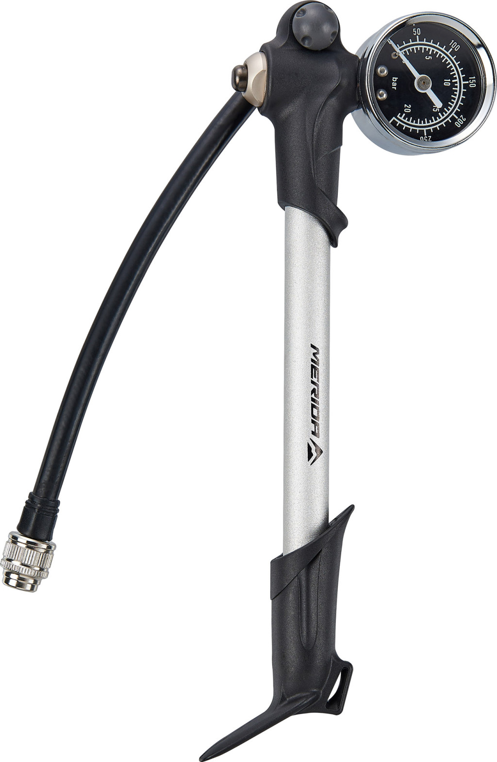 A MERIDA SHOCK PUMP kötelező tartozék mindazok számára, akik légrugós felfüggesztésű villával vagy lengéscsillapítóval rendelkeznek. Max. 300 psi/21 bar nyomásig működik, könnyű alumínium testből és műanyag fogantyúból készült. A karcolásmentes tömlőnek köszönhetően a pumpálás gyerekjáték, a pontos tárcsa pedig biztosítja, hogy mindig pont a megfelelő értéken legyen. A finomhangolást egy levegőkioldó gomb segíti, amely nyomásra 3 psi/0,2 bar nyomást enged ki.
