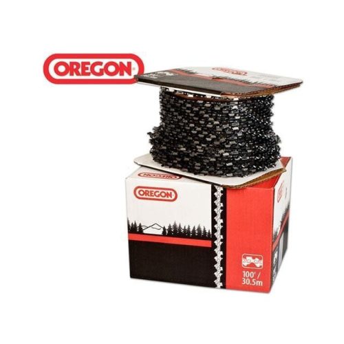 Oregon gyártmányú fűrészlánc, 100 lábas tekercsben.