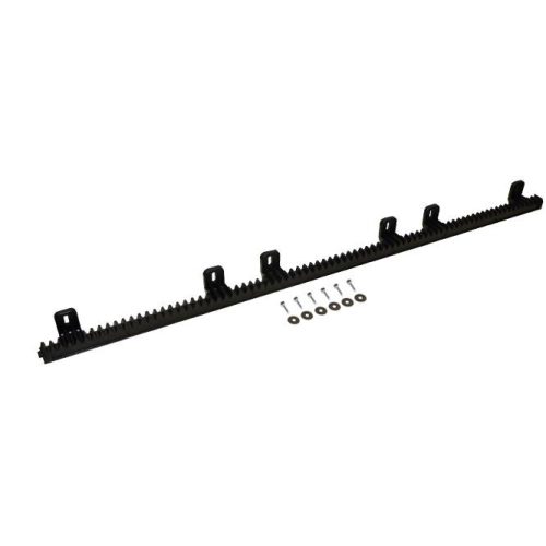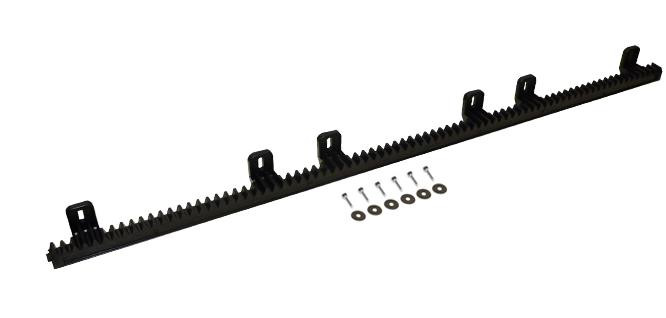 Erős, fémszál erősítésű, műanyag fogasléc tolókapu motorokhoz. A hat felfogató fül biztosítja az erős kapcsolatot a kapuhoz. Gyorsan és egyszerűen felszerelhető a mellékelt önmetsző csavarok segítségével.