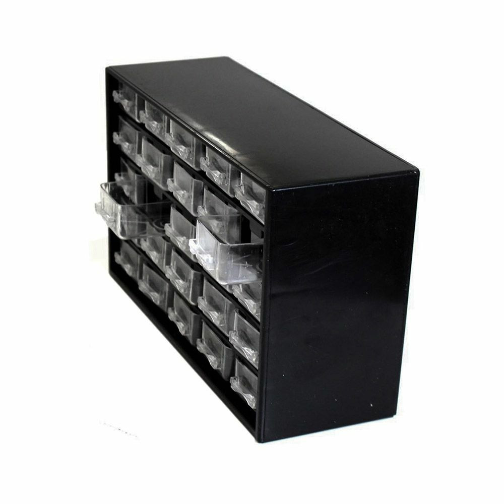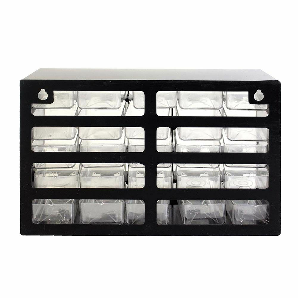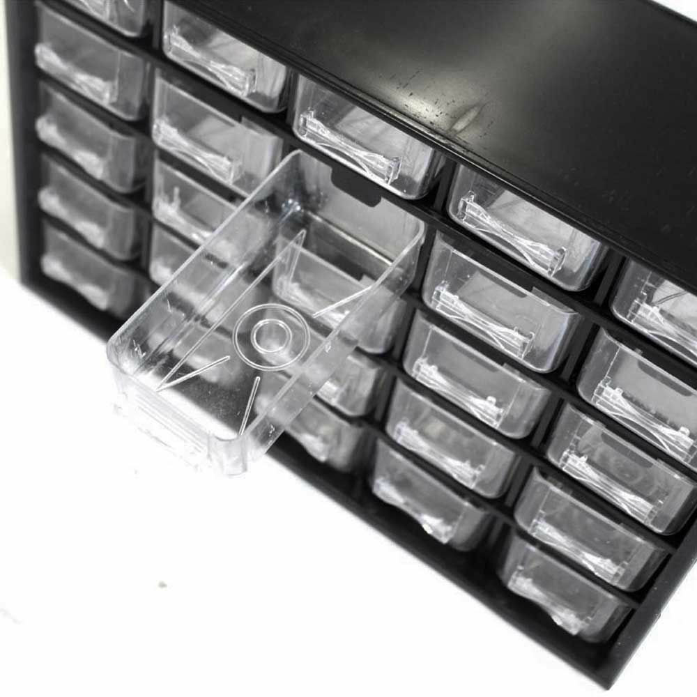 Alkatrészek és egyéb kisebb csavarok, dolgok tárolására alkalmas, 25 rekeszes tároló. Munka közben nem kell aggódnod az elguruló alkatrészek miatt. Az átlátszó műanyag fiókok lehetővé teszik, hogy a tartalmuk könnyen felismerhető legyen. A peremnek köszönhetően a fiókok nem esnek ki, teljesen kihúzott állapotban sem. A tároló szabadon felállítható vagy falra is akasztható.