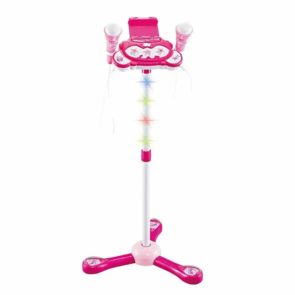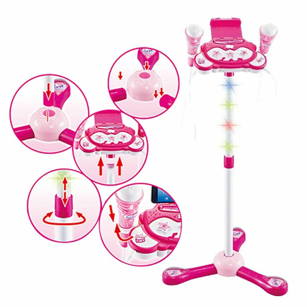 Akár okostelefont, iPod-ot is csatlakoztathatsz a játékhoz és lejátszhatjátok vele a kicsik kedvenc dallamait. A mikrofon állvány magassága állítható 70-100 cm között. Beépített dob dallamok, 10 demo dal, taps és ováció effekt is elérhető akár egyetlen gombnyomásra.