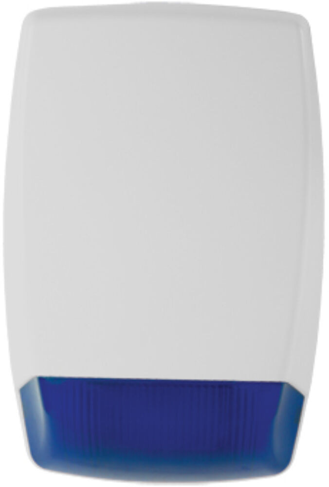Kültéri akkumulátoros hang- és fényjelző, kék, LED-es villogó, fehér ház, akkumulátoros.