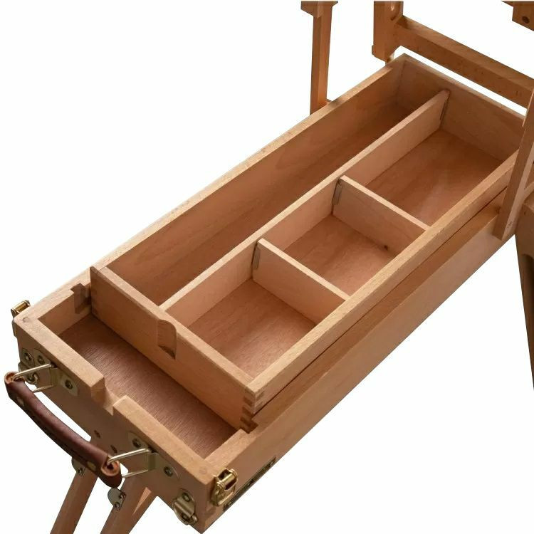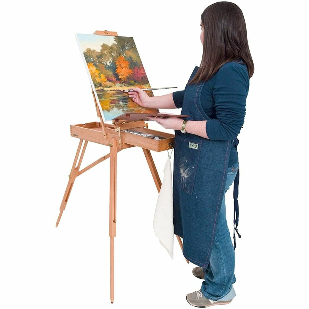 Fából készült, 3 lábú festőállvány kezdő kis művészek részére. Összecsukható, kézben és vállon is hordozható, könnyen összeszerelhető állvány, amit rajzolásra, festésre is használhatunk. Közepén egy tálca található, melyekben ecsetet, festéket, egyéb kellékeket tárolhatunk. Tartozék egy falemezből készült paletta is, melyen kikeverhetjük a tökéletes színeket az alkotáshoz.