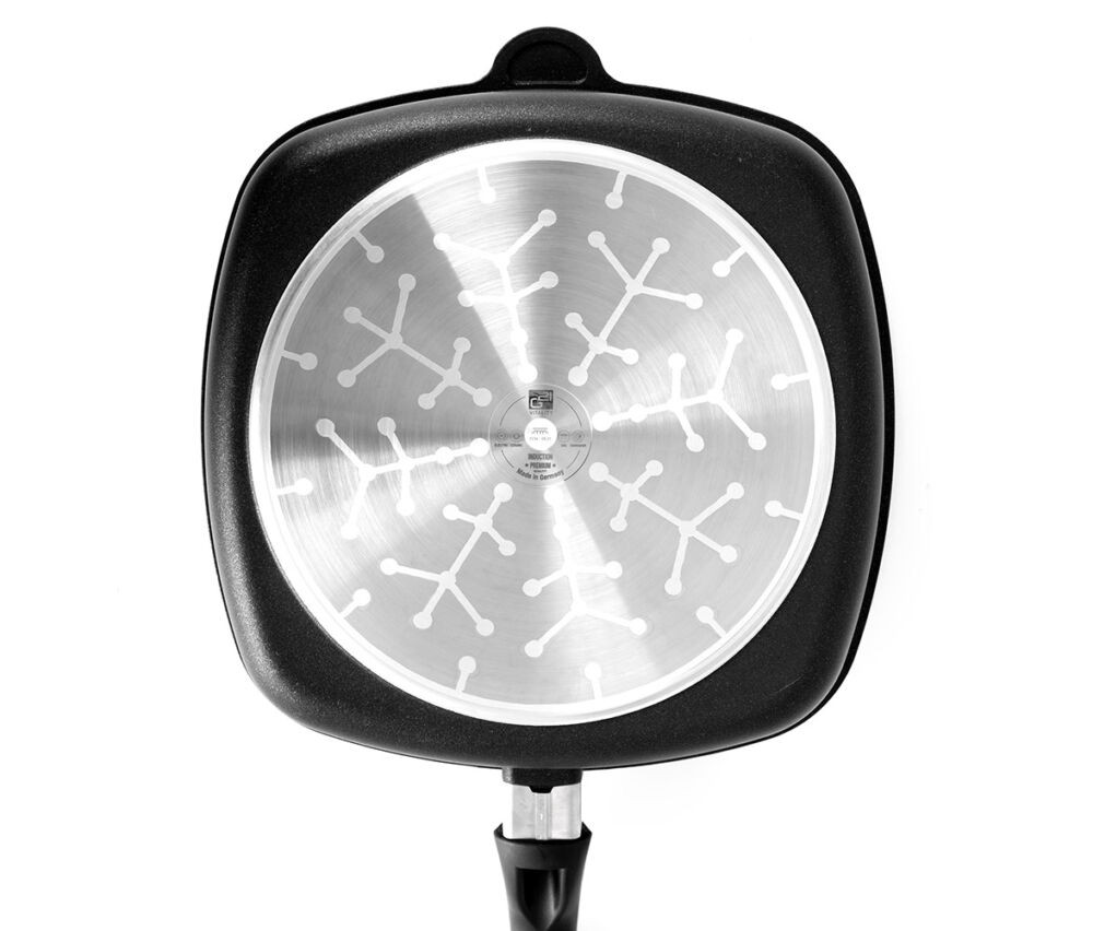 A négyzet alakú grillserpenyő vastag ötrétegű aljjal és LOTAN® tapadásmentes felülettel rendelkezik. Ideális a zsírmentes ételek készítéséhez. Univerzális, minden típusú tűzhelyhez alkalmas. Németországban gyártva, garancia 2+2 év.