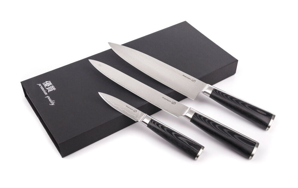 A készlet tartalmaz egy 20 cm-es vágókést és séfkést, egy univerzális kést 9 cm - es pengével. A kések pengéje minőséges 67 rétegű damaszkuszi VG-10 acélból készült keménysége 60 HRC.