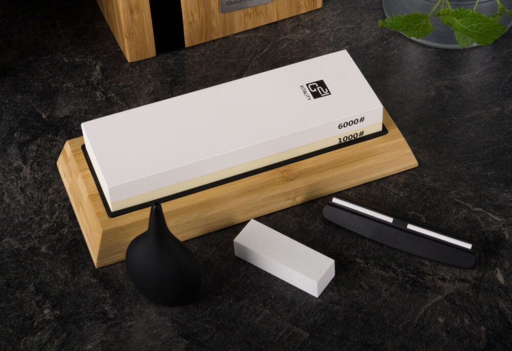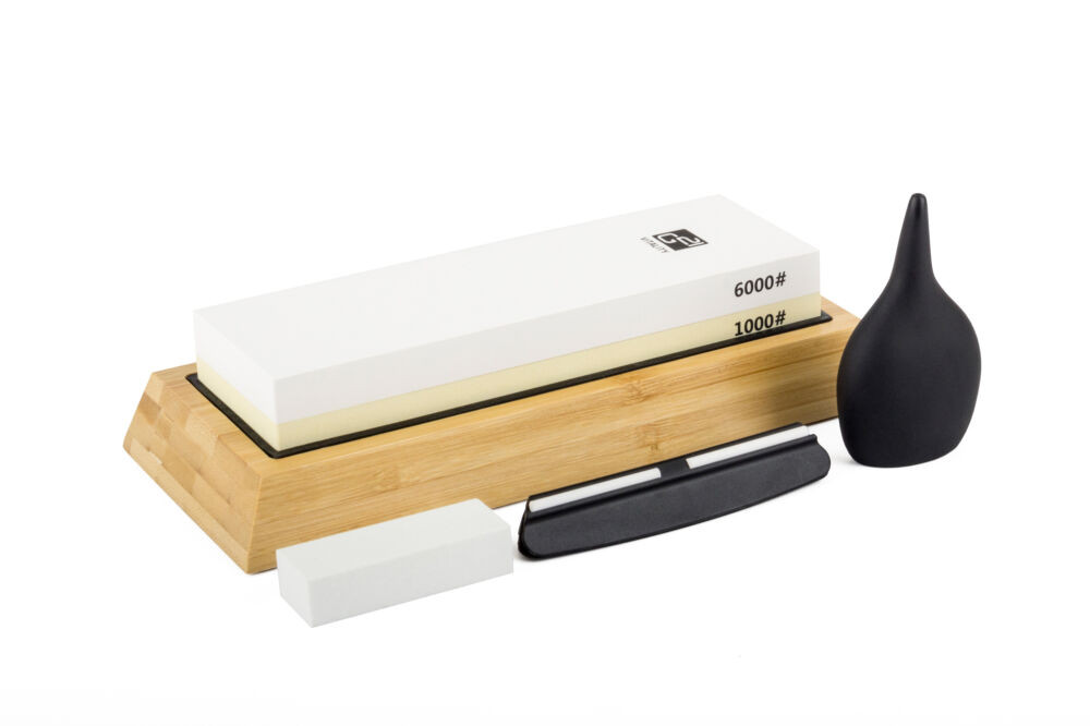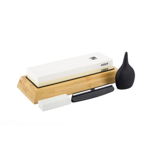 A fenőkés egy bambusztömbbe van elhelyezve. A csomag tartalmaz még egy síkolókőt, valamint egy élszögtartó segédet. Szemcseméret: # 1000 / # 6000 grit