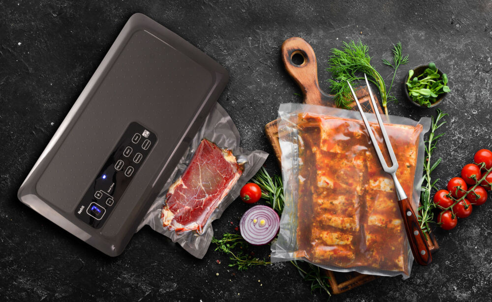 Az elkészített steak porszívózása G21 Onyx vákuumhegesztővel. Grillezésre kész G21 vákuumzsákban pácolt hús.